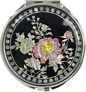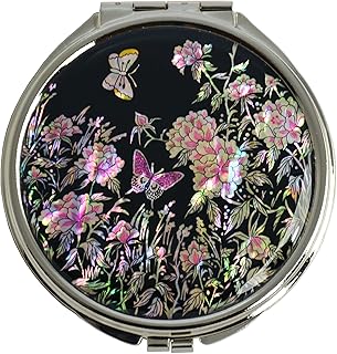 Miroir de sac design, fleurs de pivoines et papillon. Artisanat Coréen en nacre véritable, accessoire de luxe pour maquillage