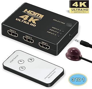 Switch HDMI 4K Commutateur HDMI Sélecteur HDMI 3 Entrées 1 Sortie 2K @ 60Hz/1080P/3D Adaptateur HDMI pour PS3/PS4/XBox 360/Blu-Ray/HDTV/DVD/Projecteur, avec Télécommande IR